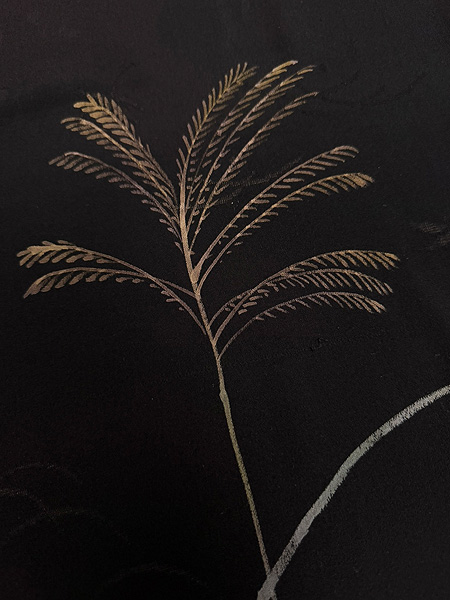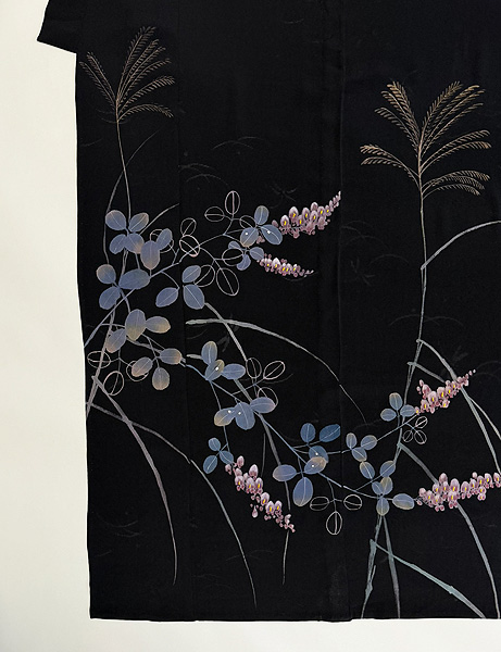 露芝やとんぼの透かし文様が入った黒のやわらかな錦紗に、萩と薄を描いた付下です。