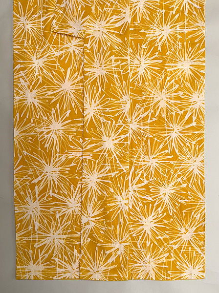 両褄文の上前は流水文と八重桔梗、下前には水面のような十字文と水に泳ぐ小魚があしらわれています。
