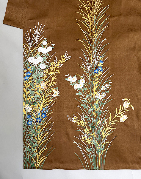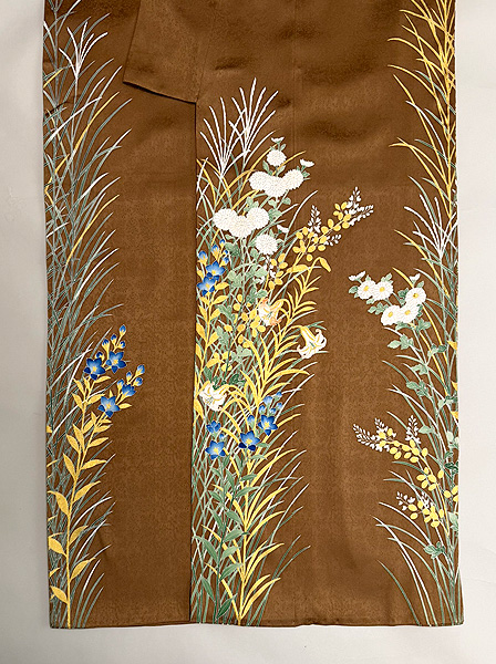 胸や袖、裾に秋の野の花々が咲き乱れてお出かけを待っています。