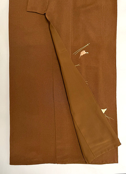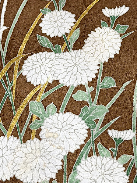 扇面の地紋が入った生地は、茶色がかった梅鼠色のグラデーションがシックで秋らしい色合いです。
