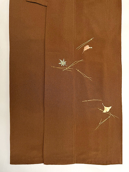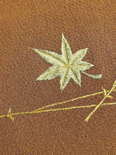 深い栗色の縮緬地に吹き寄せとなったもみじ、イチョウと松葉。