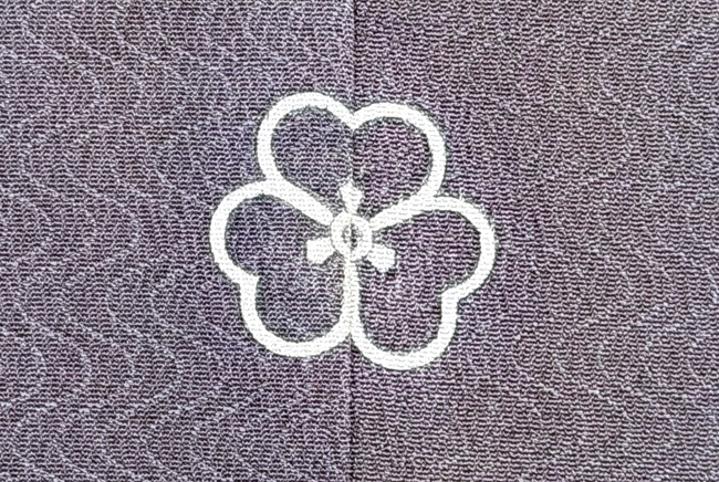 一越の紋縮緬に小さな波文様が織り込まれていて、重みのある素材感に、かたばみの三つ紋が似合っています。