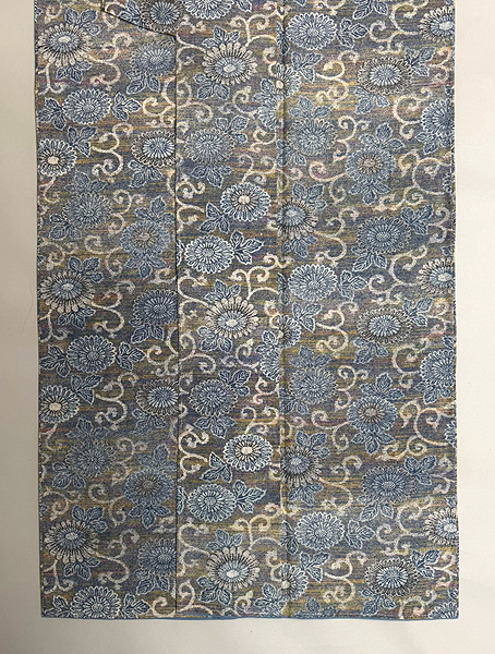 こちらは定番の菊唐草文様ですが茜、苅安、藍を3度程型を変えて染め上げています。