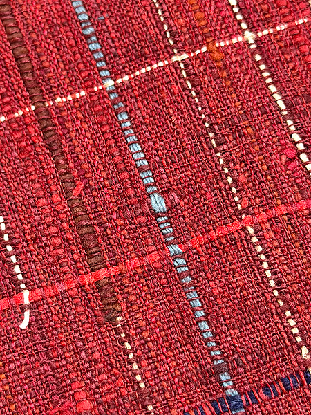 赤色に白、黒、藍等太い節のある糸を織り込んでいます。