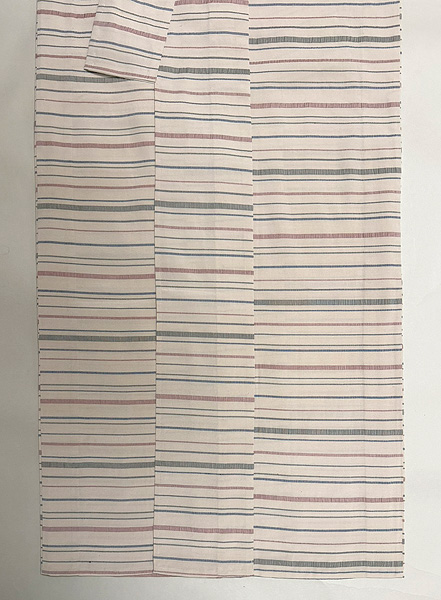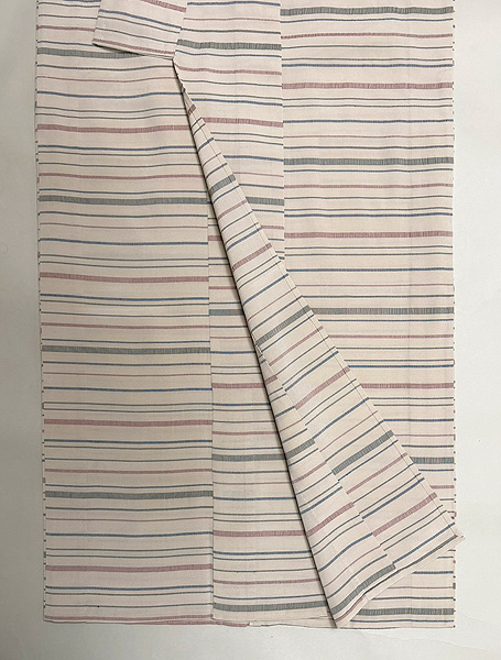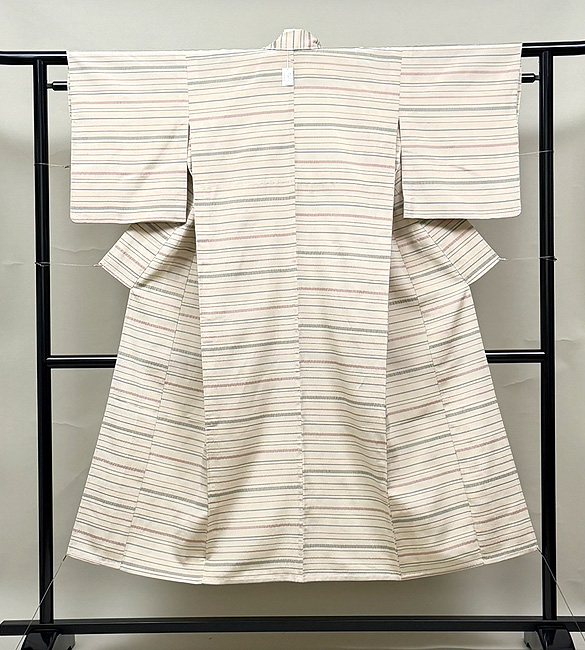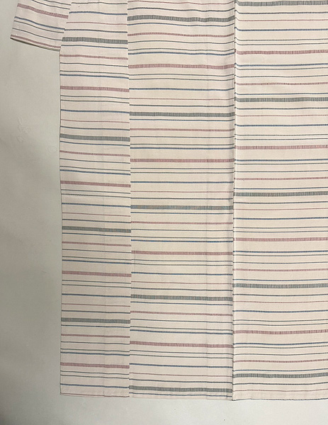 白地に薄いピンク、ブルー、オリーブグリーンの細い横縞が走った爽やかな単衣です。