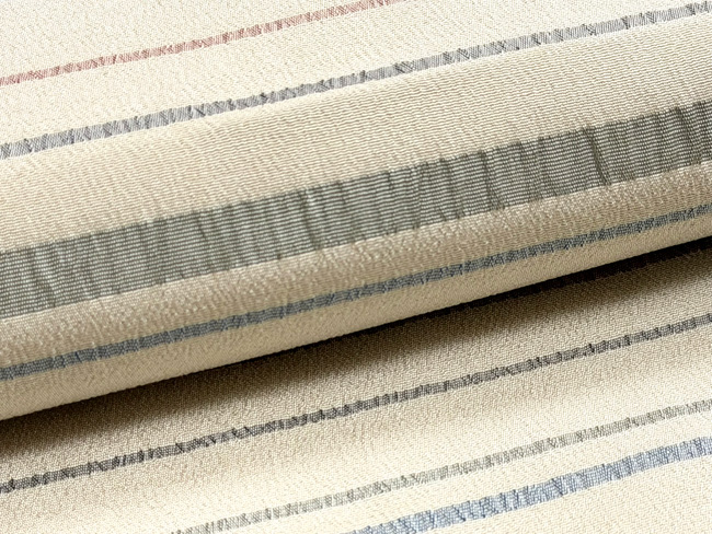 優しいピンク色を主にうっすらと黄色味も感じる色合い。縞の緑は藍をかけることによって表現するとのこと。