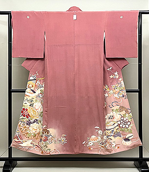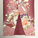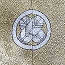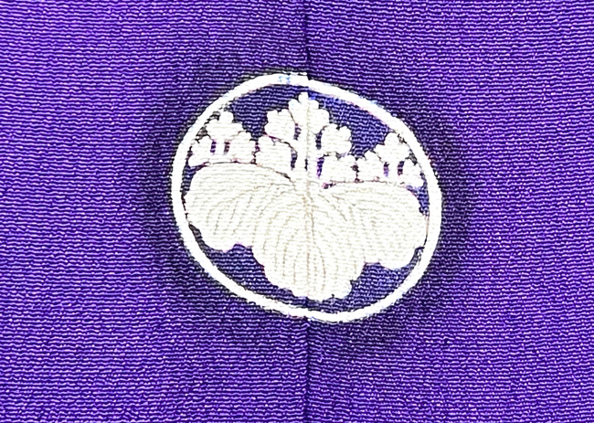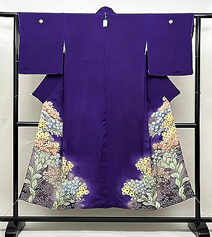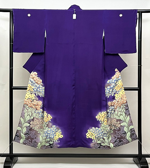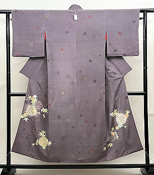 裾の吹き寄せ文様と笹竜胆の一つ紋とが、みごとな刺繍で表現されています。