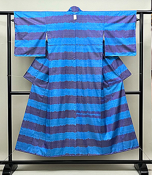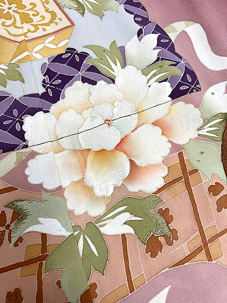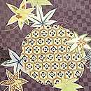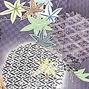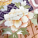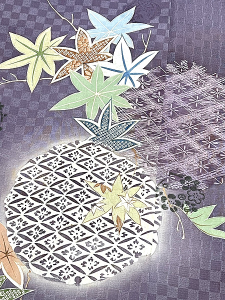 錦紗の変わり織で、細い黒い線に扇面の地紋が浮き出て、唐草のかすり足と共に着物の柄に深みを出しています。