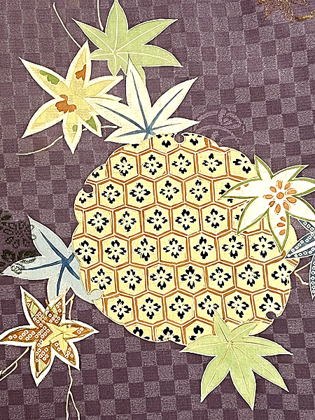 深い栗色の縮緬地に吹き寄せとなったもみじ、イチョウと松葉。