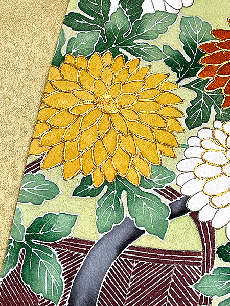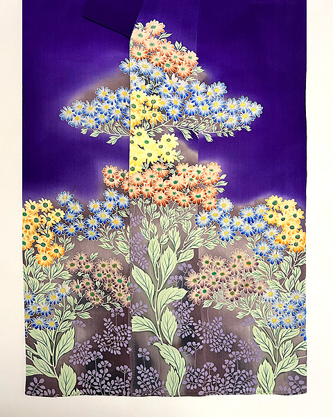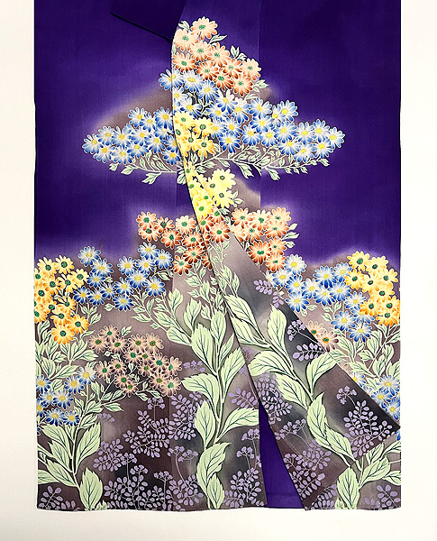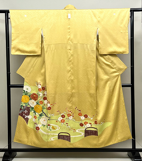 胸や袖、裾に秋の野の花々が咲き乱れてお出かけを待っています。