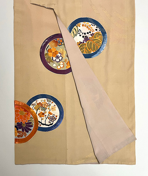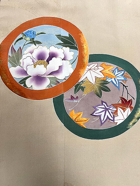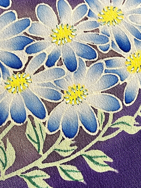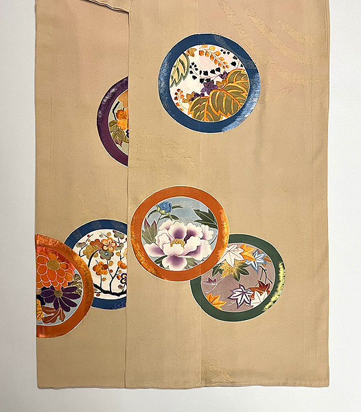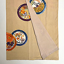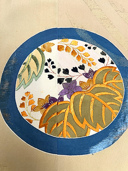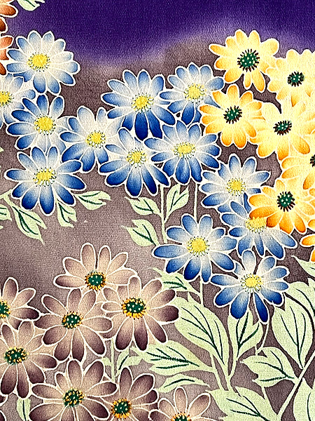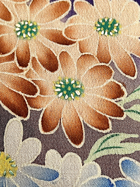 地の染め色も日本の中間色の心憎い組み合わせ、すこし抽象化された菊もモダン、昔の良い羽織に触れるのは目も手も喜びです。