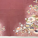 落ち着いたやわらかなピンクのお色目に、小豆色と白の横段の雲、万寿菊が一面に織り込まれたとても品の良い、合わせやすいお羽織です。