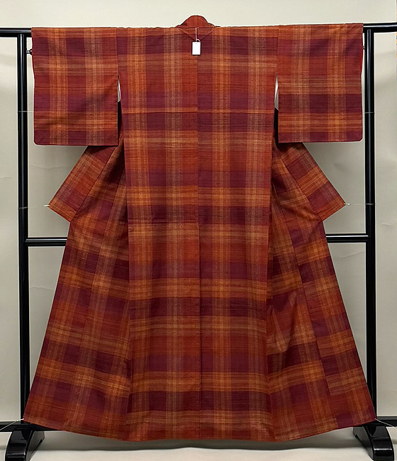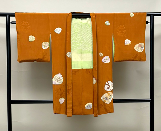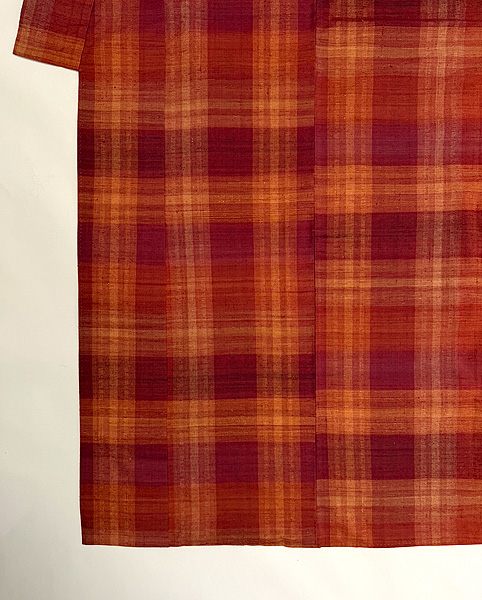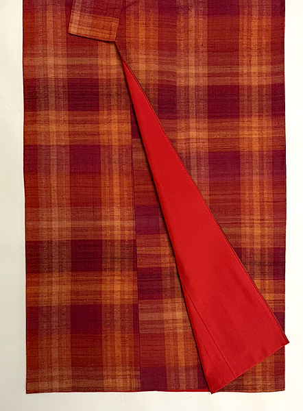 シボのある生地は軽くてやわらかく着心地がよさそうで、袖口と裾にちらりと見える黄金色の八掛と袖の振りの赤い色が、なんともおしゃれです。