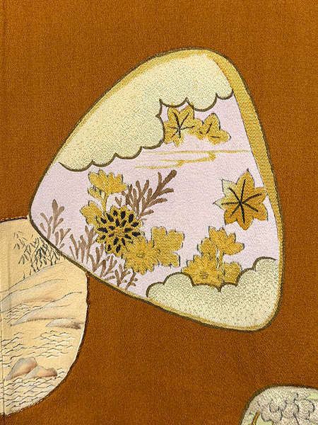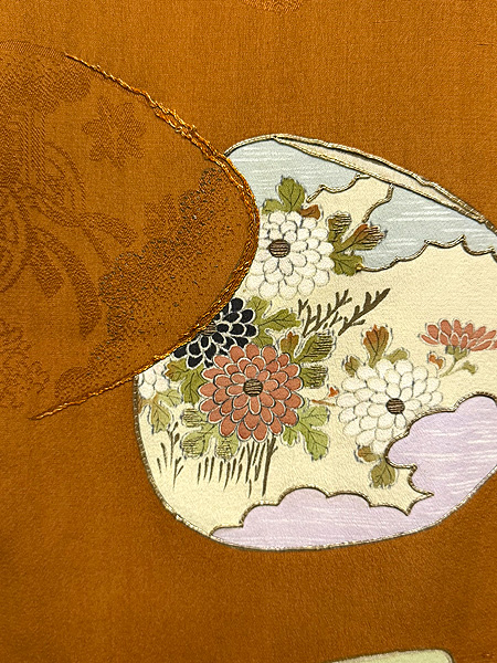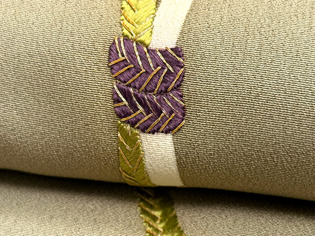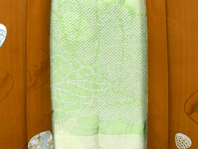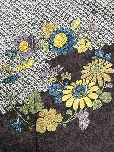 大きな貝と菊は絞りで、笹は色とりどりの大胆な刺繍で表現されています。