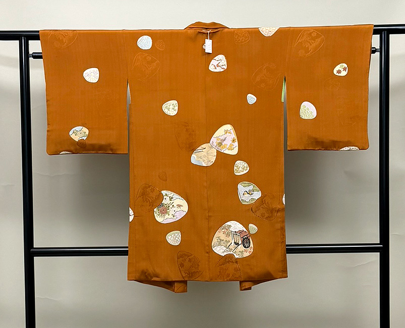 照柿色という渋くも華やかなオレンジの中に、貝合わせの貝たちが散らばっています。
