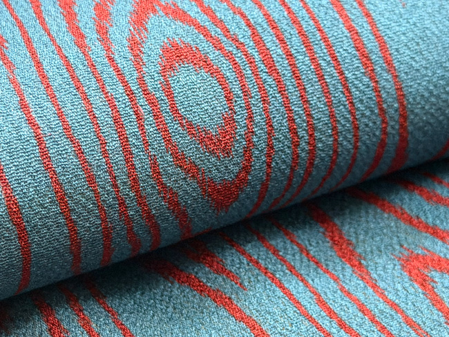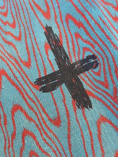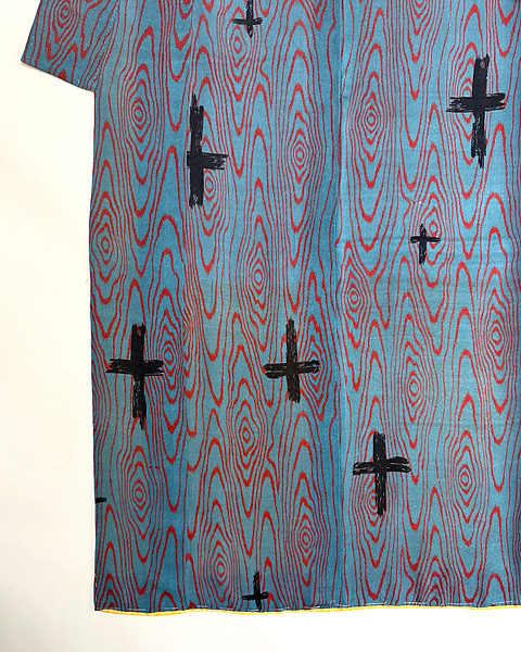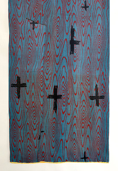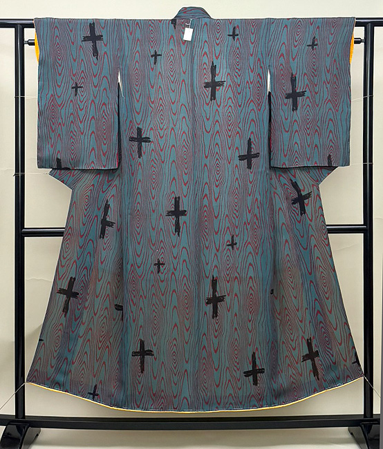 鈍い青緑に朱色の杢目と十字絣を模した黒い文様を染めた個性的な柄の小紋です。
