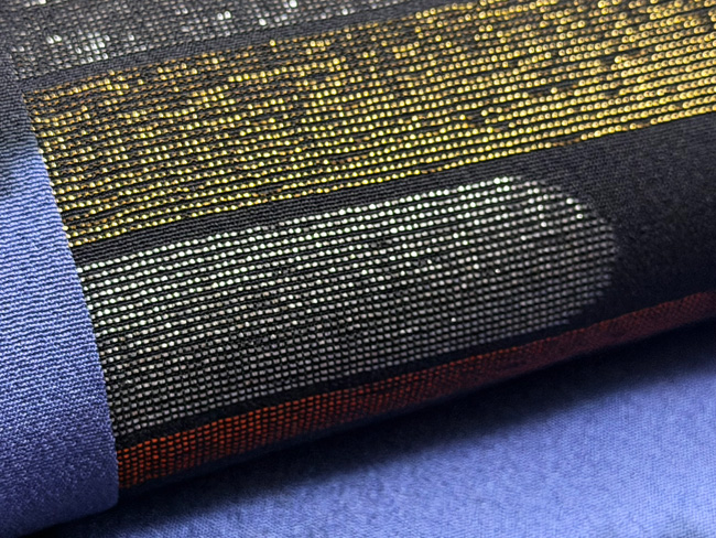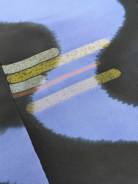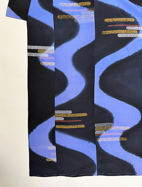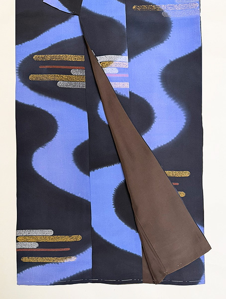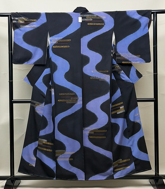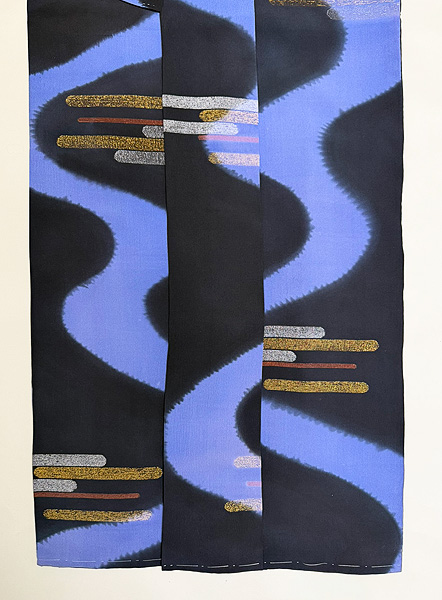 黒地にきれいな縹色で流水をだいたんに置き、金銀赤の漆糸で霞を縫い取りしています。