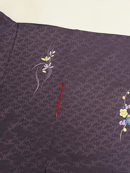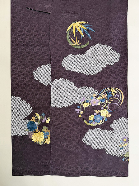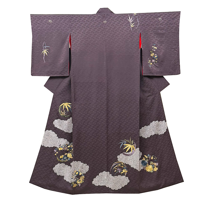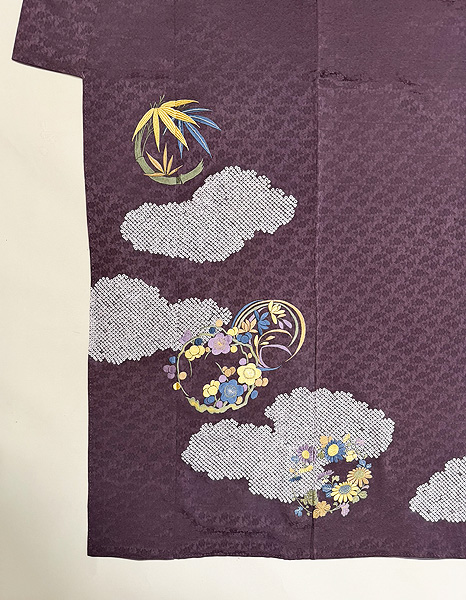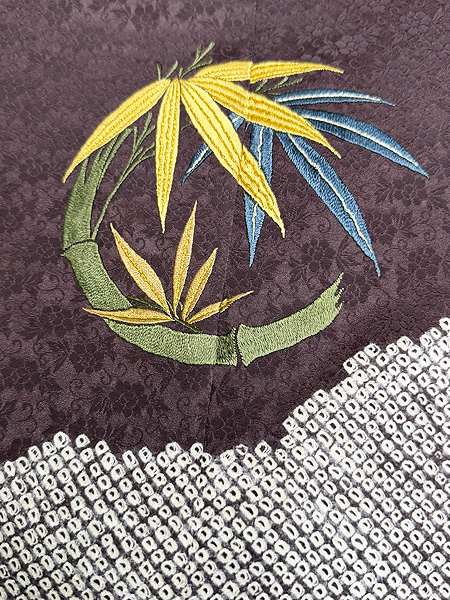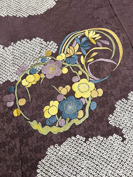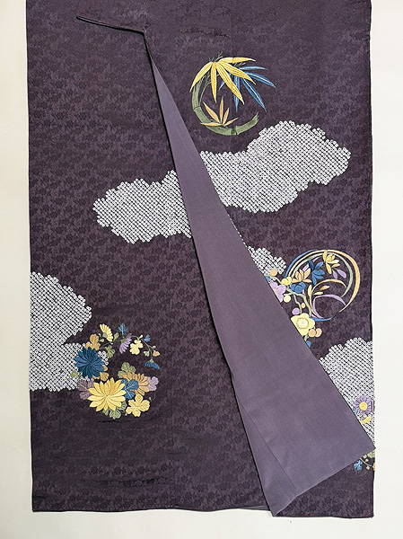 深紫の地に、牡丹唐草の地紋、大きな雲形の鹿の子絞り、竹・梅・菊・蘭の四君子を品の良い色糸で刺繍した格調ある付下。