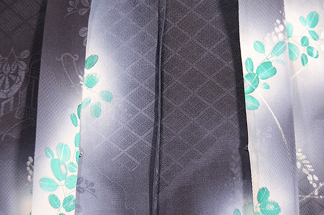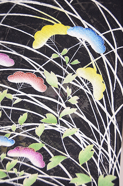 黒地の上に描かれた友禅は、艶やかで魅力的なアンティーク単衣ならではの美しさです。