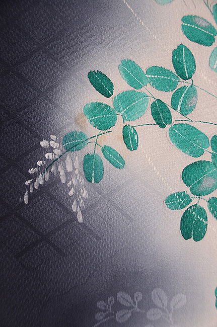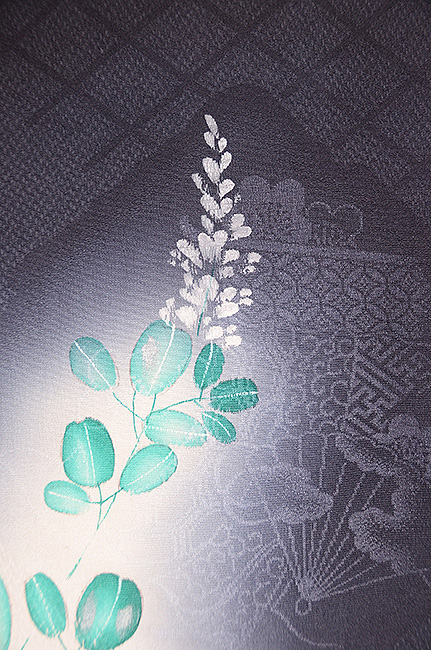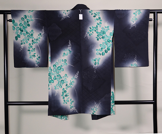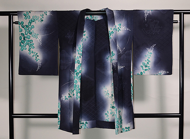 銀通しの艶やかな群青色に、大きな芝露と、大きなうちわの文様が艶めかしくも凛と格調あるお羽織です。