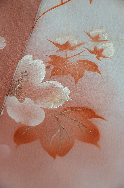 朝霧の中に、芙蓉の花が幻想的に浮かび上がっている風情が感じられるお着物です。