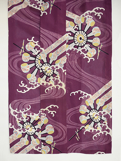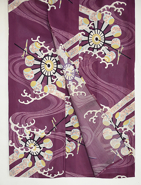 瀬の流れと回る水車がダイナミックに配された、単衣小紋です。