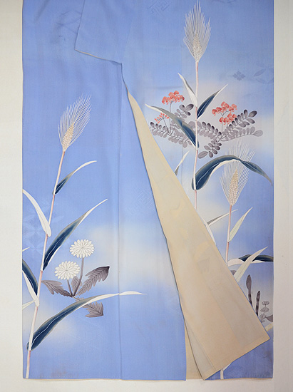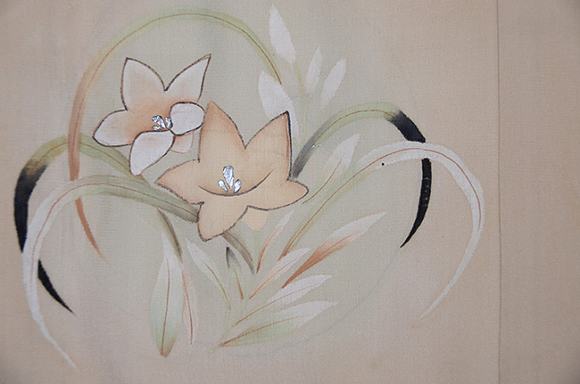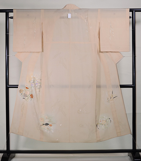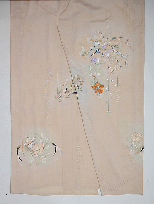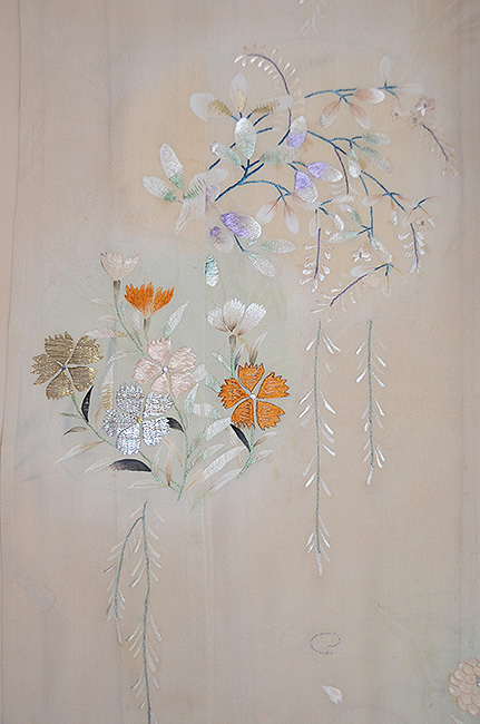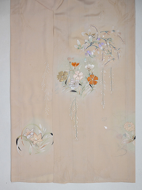 ベージュ地のやさしい紋錦紗に藤の枝、撫子、裾にタンポポが友禅と刺繍で表現されています。