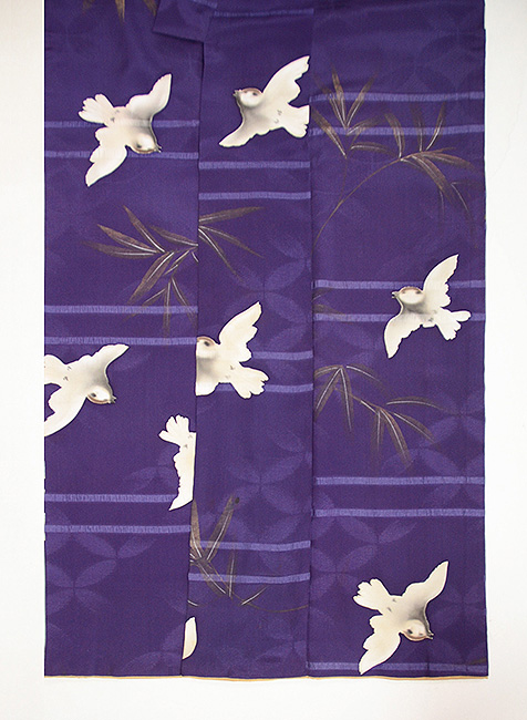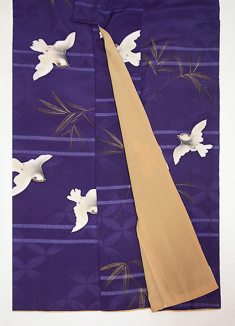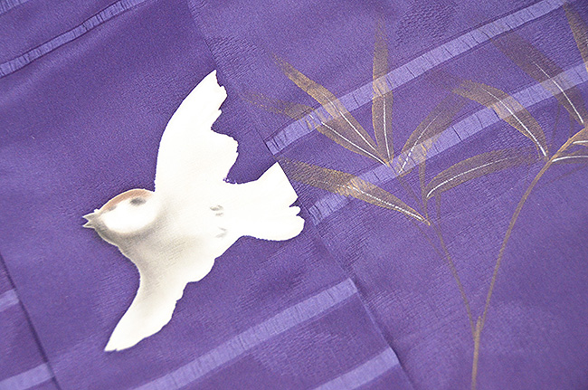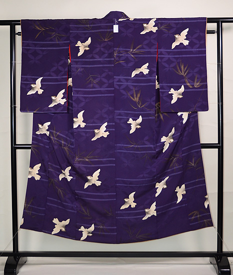 パープルを中心に、抑えた色で、大胆なデザインの中にも品性の保たれたお着物です。