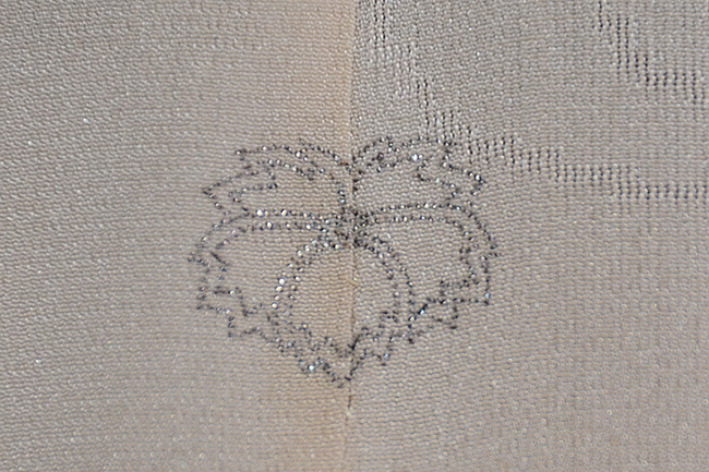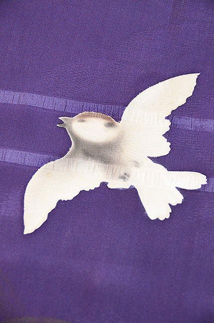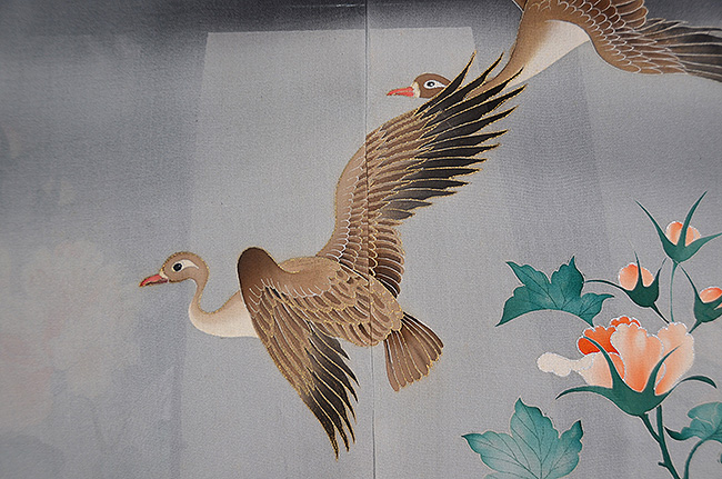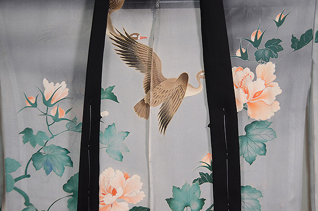 金糸を使った非常に難しい刺繍で、白鷺が舞っている情景を表現しています。
