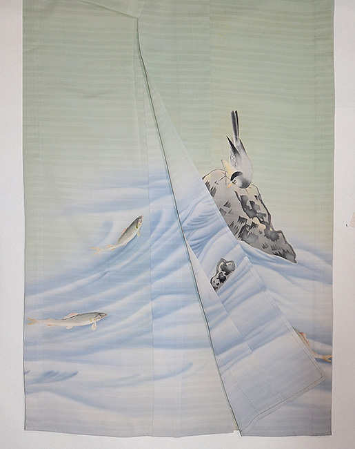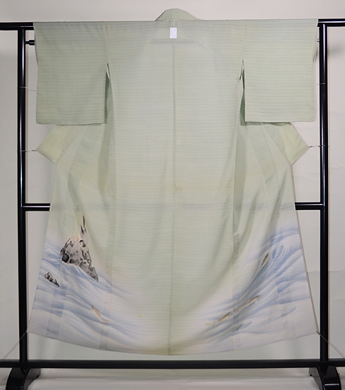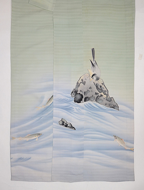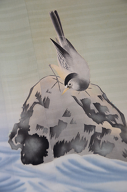 流れと岩場の鳥を囲む空気感とが、新緑の季節を詠った、爽やかな初夏のお着物です。