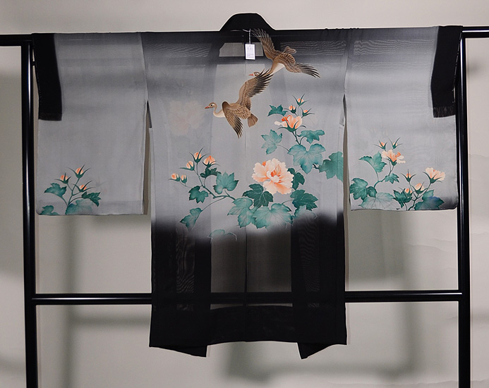 黒いぼかしの中に牡丹の花と、鴨のカップルが、ダイナミックに配されています。
