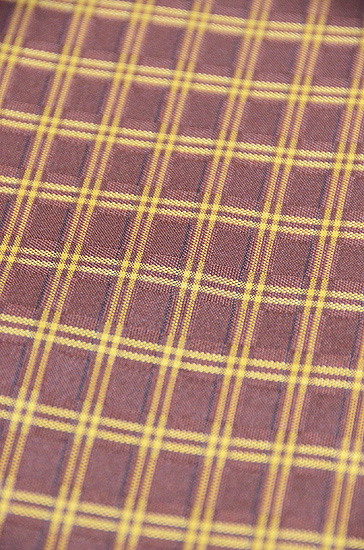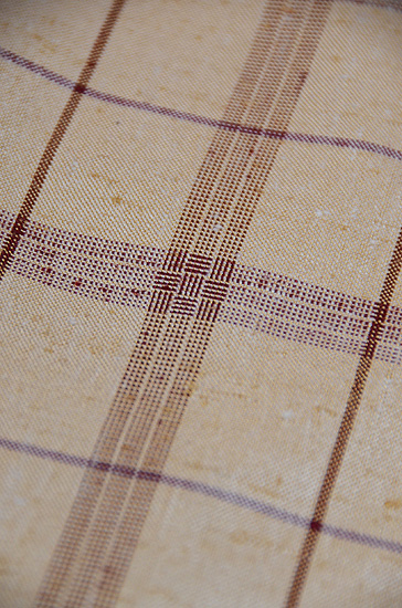 そして、格子の所は、縦に海老茶を、横に紫を入れているように見えますが、紫に見える所は緯糸の辛子を外して紫に見せる、というマジックを使っています。