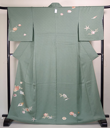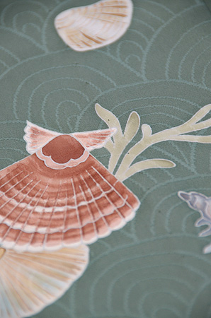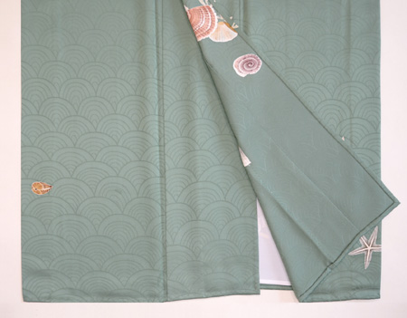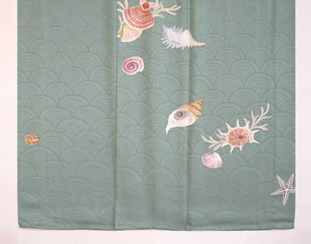 深い海、寄せ来る波に守られて、貝たちが歌っているようなお着物です。