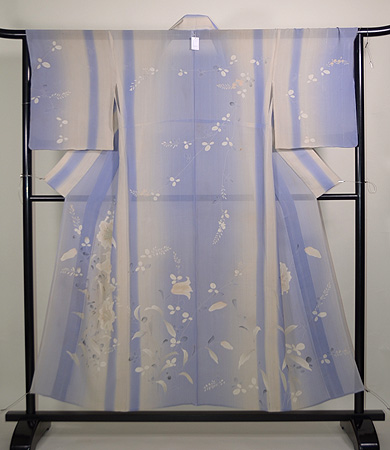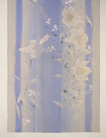 青藤色の縦暈しの中に、萩が咲き乱れ、裾には百合の花が匂うかのごとくです。