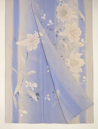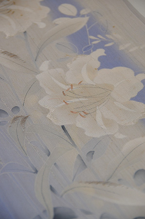 薄紫暈しの紋金紗は大輪のユリが透かしで涼やかです。