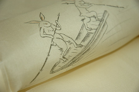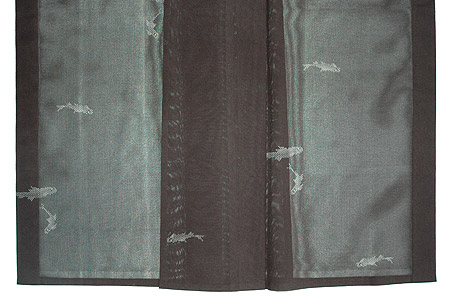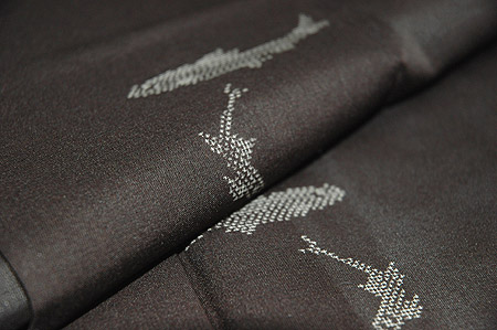 紗ならではの張り感が気持ちよく、黒地ならではのきりりとした地に白く織り出された鮎の柄が小粋な印象です。
