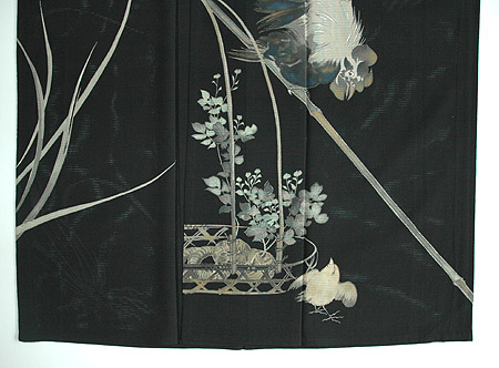 先に枝の上に昇った雄鶏が心配そうに雛を見守る、墨絵風の黒留袖です。