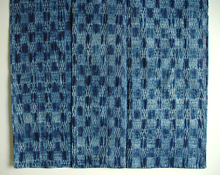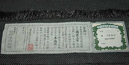 『ていねいに湯通しを施してありますが、藍が枯れるまで色落ちがありますのでお仕立てになる前にもう一度湯通しをされても結構です。お洗濯はつかみ又はもみ洗い、藍が付着しても石ケン水にてきれいに落とすことができます。』と証紙に書いてあります。