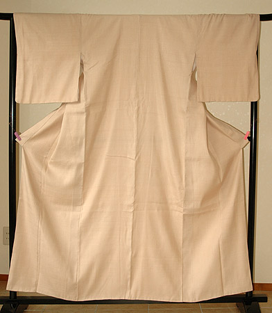 着物09-5-22の江戸小紋袷が柳色の色合いなのに対して、こちらは淡い薄紅の万筋です。