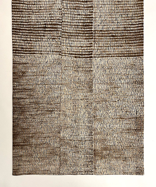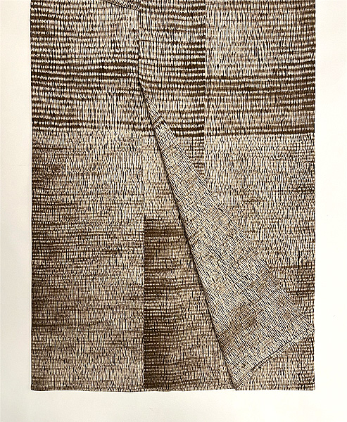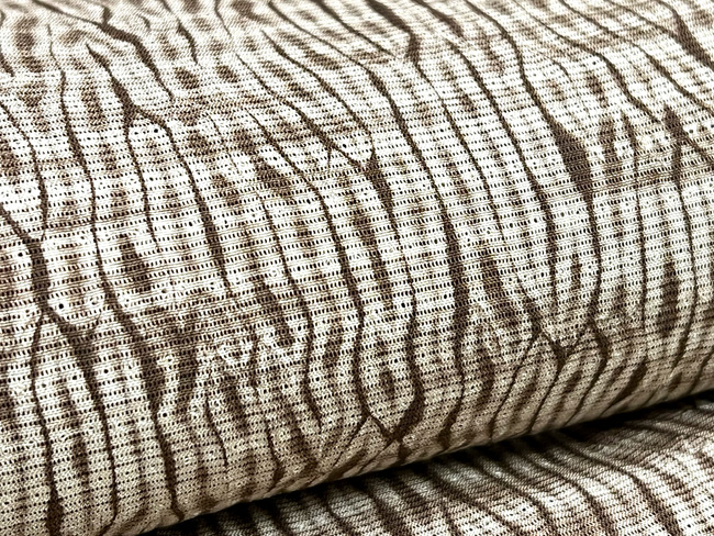 蚊絣と亀甲とで、縦に大きな縞文様が織り出された、スッキリと勢いのある本塩沢です。
