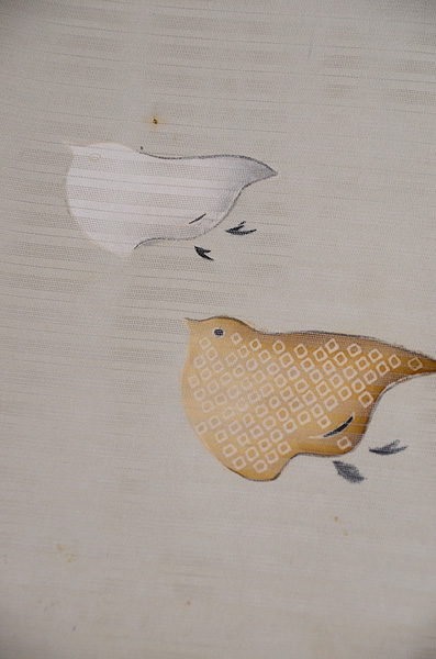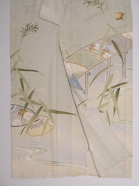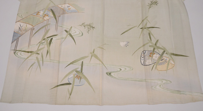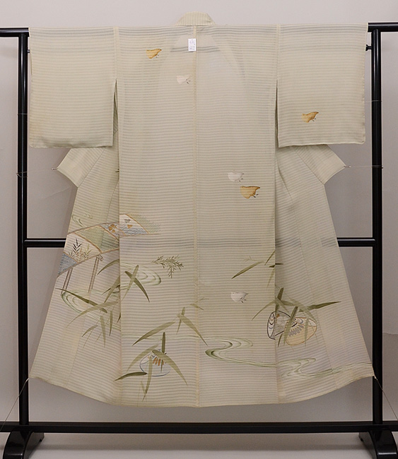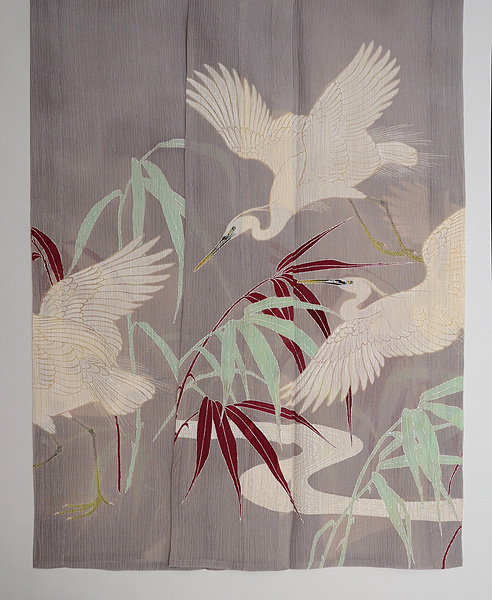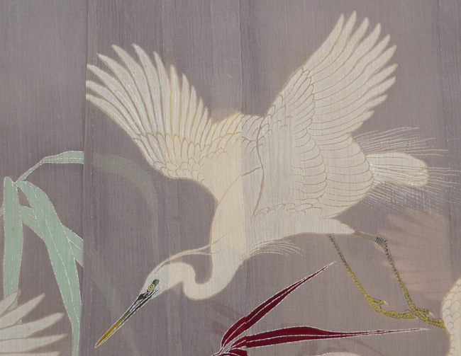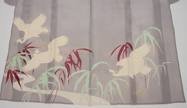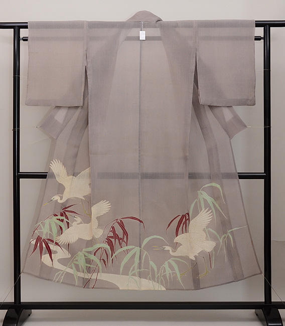 銀鼠の地に、白鷺と葉っぱの色が、優しく爽やかな印象の夏着物です。