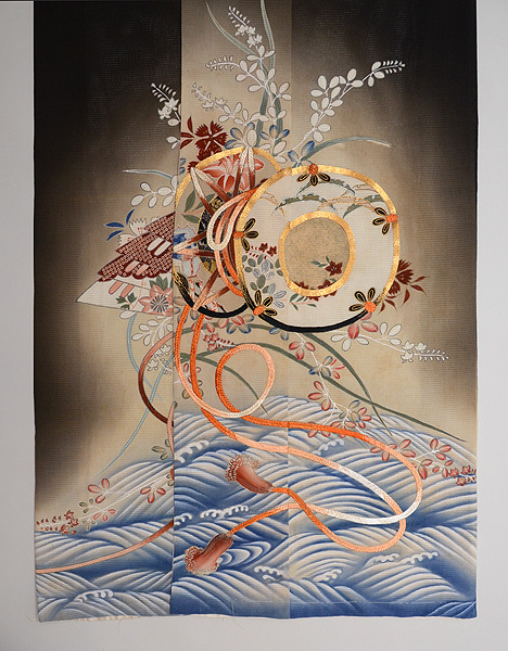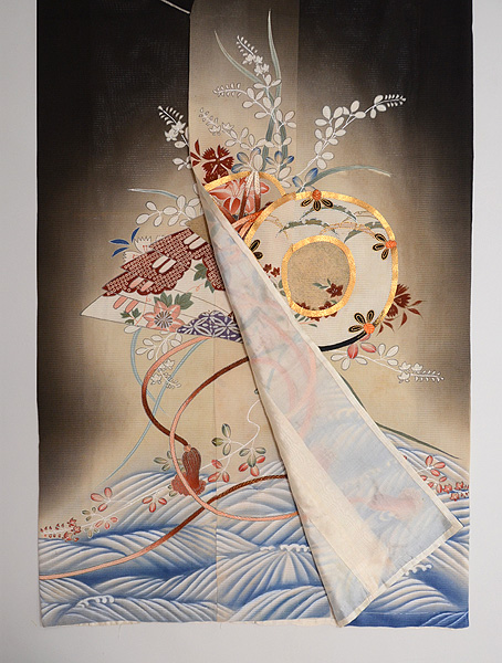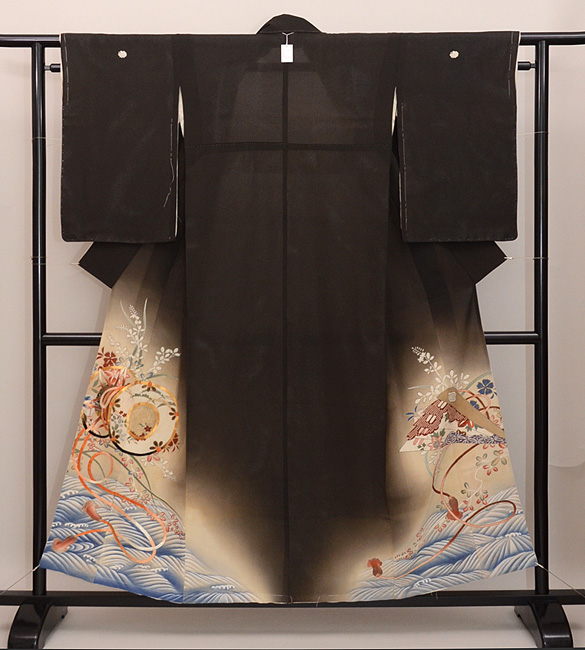 謡曲屋島を連想させるモチーフが並んで、格調高い黒留袖です。