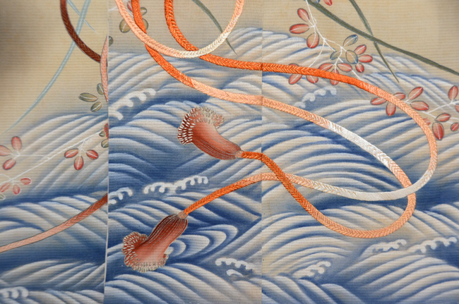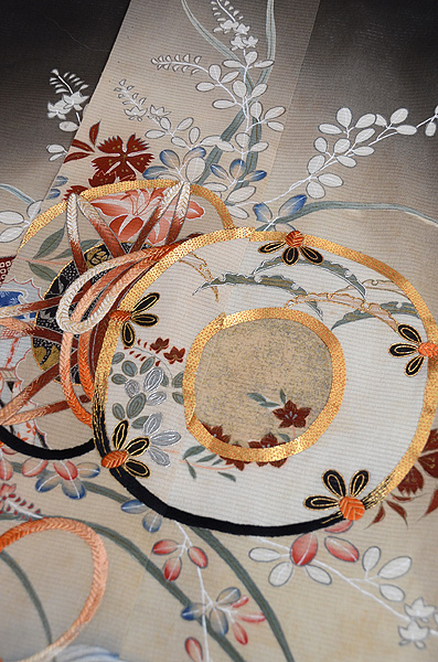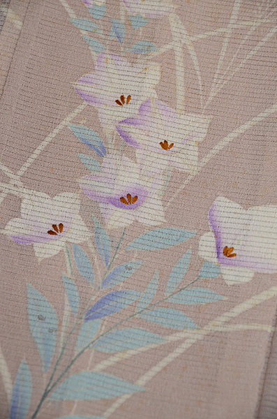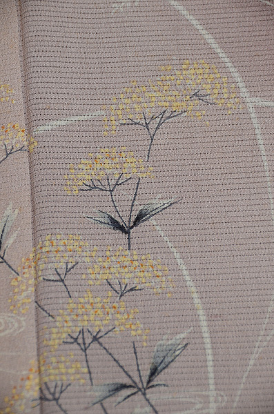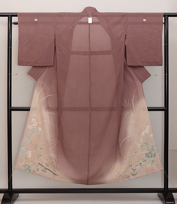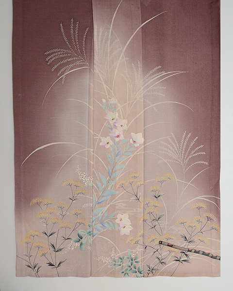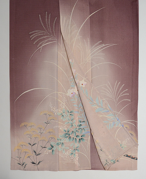 きれいな葡萄色の両褄がぼかされて、女郎花と桔梗、萩の秋花が可憐にたおやかに描かれています。