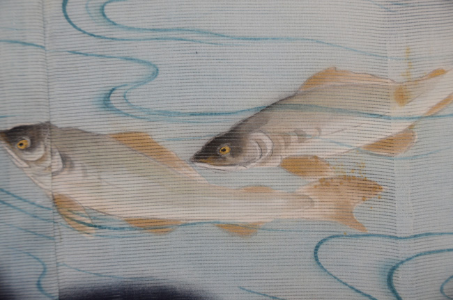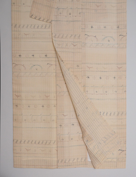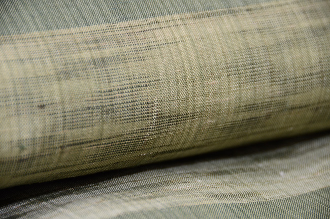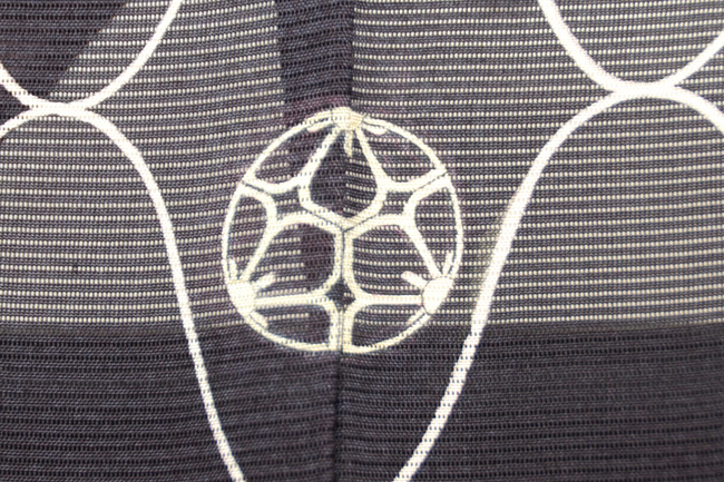 楊柳に織られた薄い紋には山道文様が走っていて、縦縞との取り合わせが入り組んで、複雑なおもしろさを見せています。