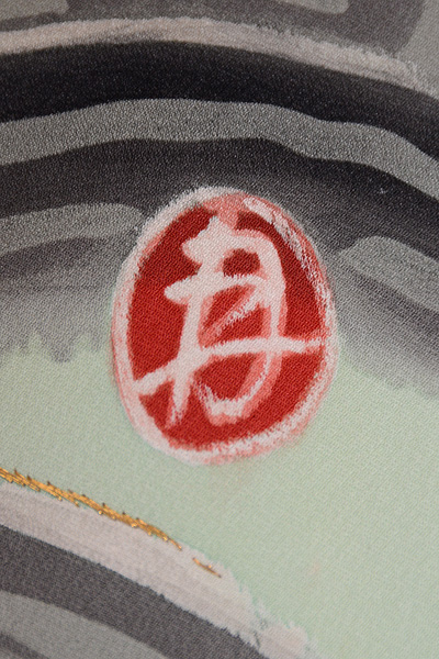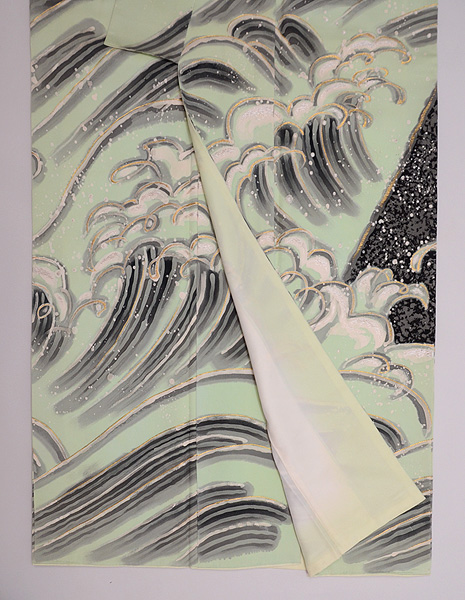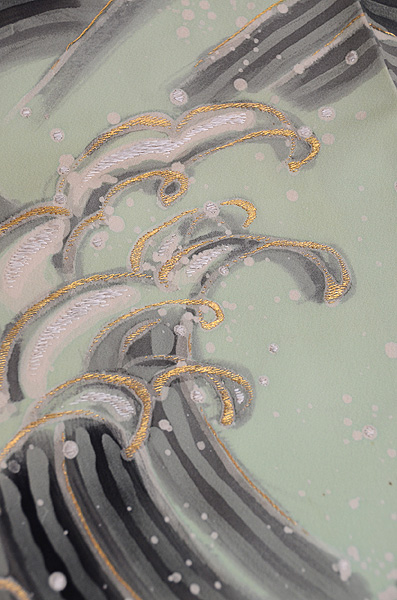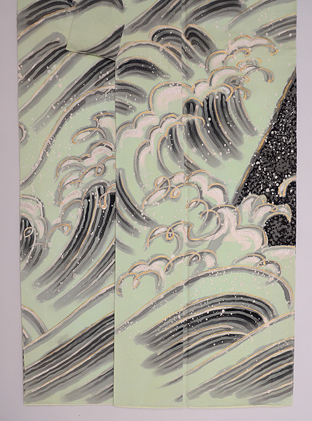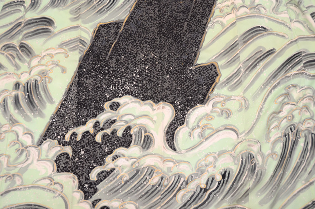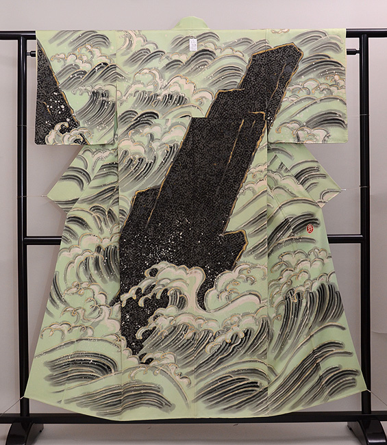 大きな岩礁に、抗うが如きの逆巻く怒涛を、手描き友禅と、撒き糊、刺繍の技法で表現されています。