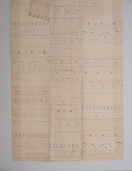 素朴でかわいい抽象柄が並んだ、とてもソフトタッチな草木染め木版の着物です。