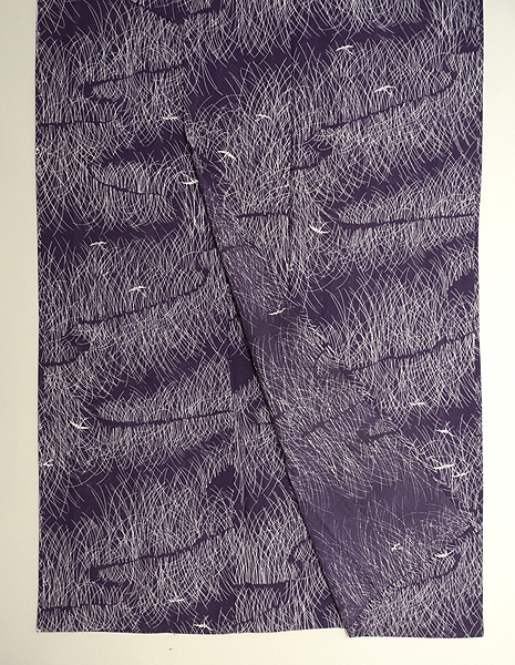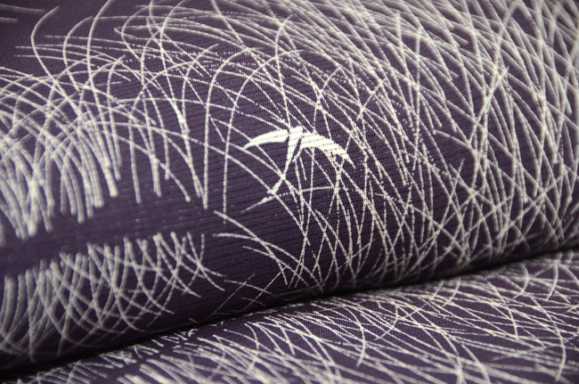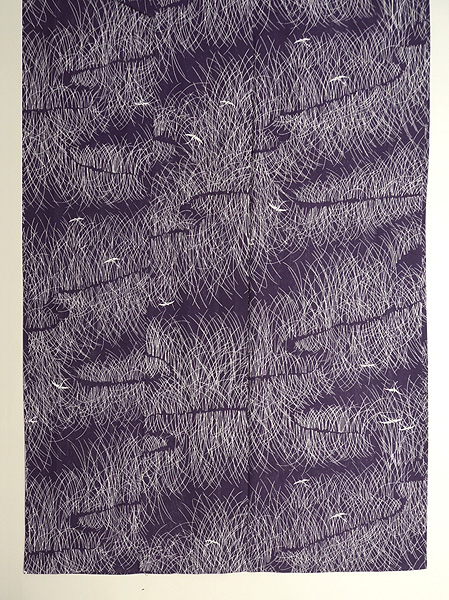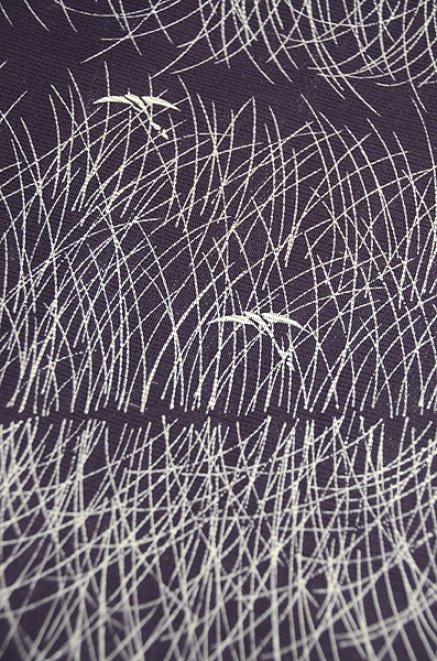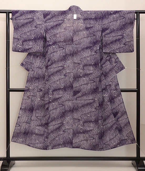 紫地に白抜きの型染め小紋で、爽やかな風の吹き抜ける風情が感じられます。