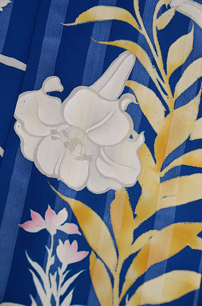 水文がぼかしで入り、銀の漆糸で、水辺の菖蒲と朝顔とが織り出されています。