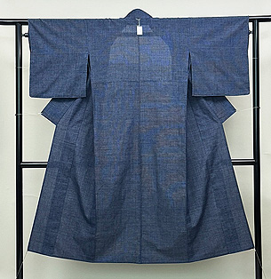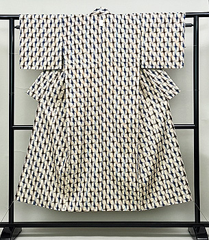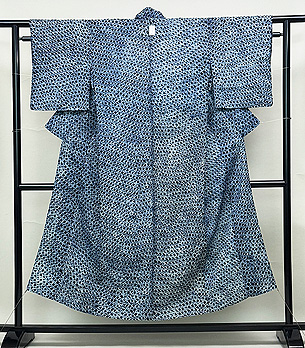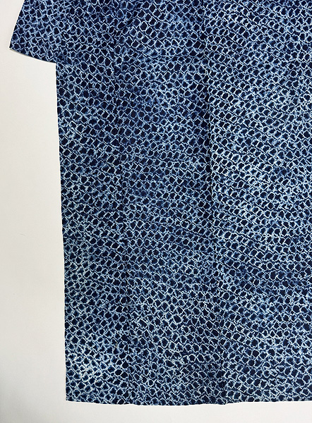 ざっくりした風合いの生紬の生地に板締め絞りで文様を付けた単衣の着物です。