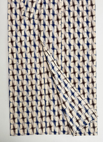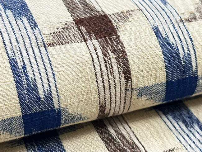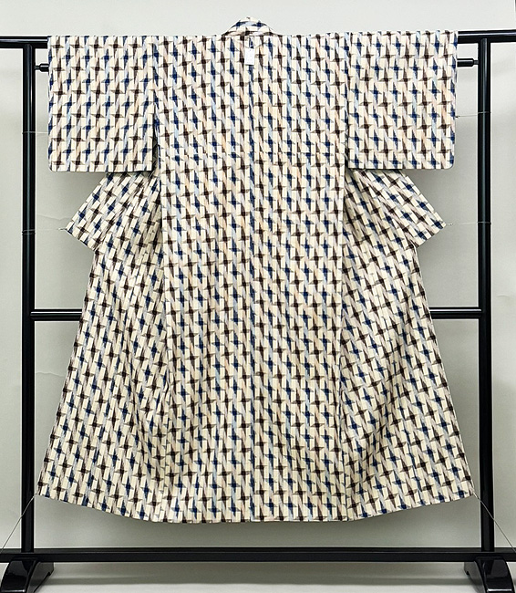 十字絣を織り込んだ生成りと芝翫茶を交互に織った粋な横段の単衣。